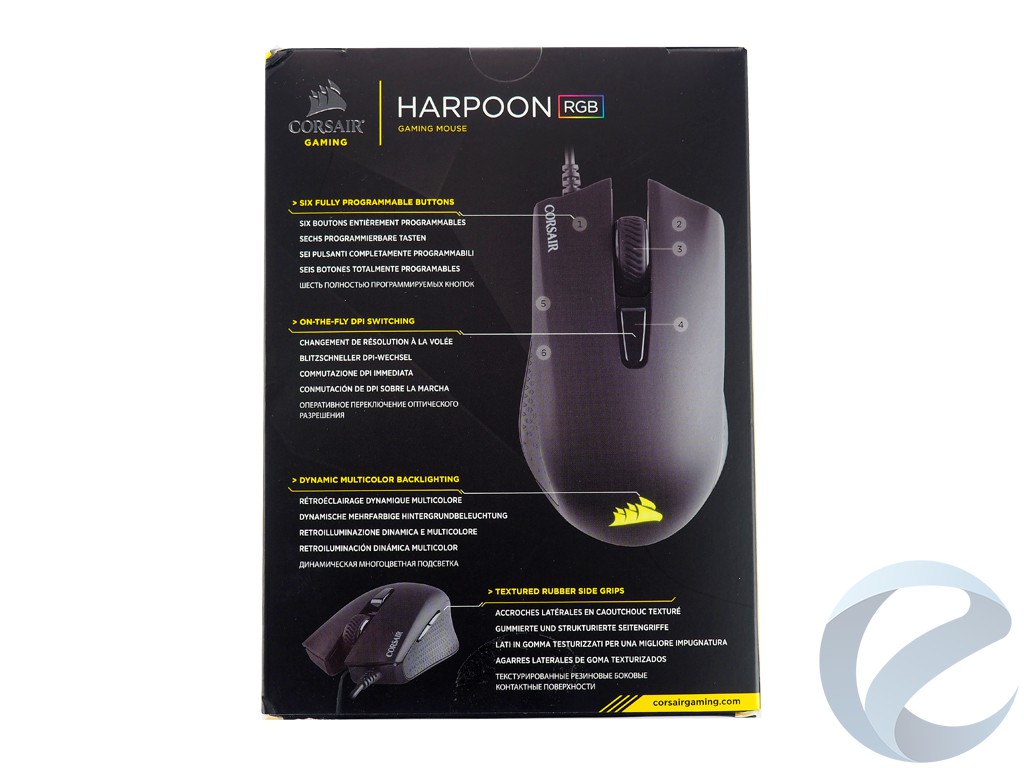 На тыльной стороне также изображен манипулятор с видом сверху и обозначением всех кнопок. Кроме того здесь дано описание основного функционала манипулятора. Боковые стороны содержат краткое описание особенностей Harpoon RGB на шести языках.