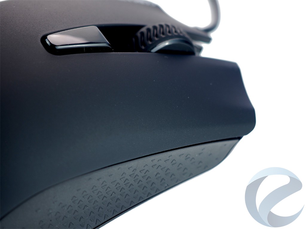 Мышь имеет две боковые прорезиненные рифленые вкладки с рисунком в виде треугольников. На левой стороне находятся две боковые кнопки для большого пальца. Их расположение очень удачное, так как нажатие кнопок большим пальцем происходит без каких-либо затруднений и с ощутимым ярким звуком.
