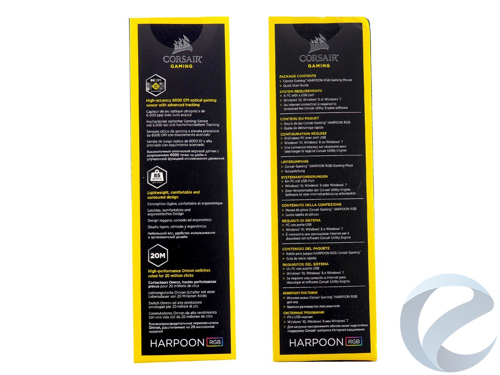 Упаковка выглядит довольно просто. Скромное оформление в черных тонах с ярко-желтыми рамками и глянцевыми вставками. Информативность упаковки реализована на хорошем уровне c упором на достоинства манипулятора. Многие производители стали отказываться от прозрачных коробок, видимо, пытаясь снизить затраты на производство. В нашем случае, это неоспоримый факт, так как мышь Harpoon RGB попадает в сегмент недорогих манипуляторов.
