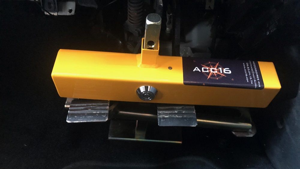Некоторые автовладельцы предпочитают устанавливать защиту на педаль акселератора, в продаже появились комбинированные устройства, фиксирующие и педаль, и руль от нажатия/поворачивания соответственно. Конструкция замка такова, что он может свободно перемещаться по направляющей, что делает устройство универсальным, подходящим для большинства моделей авто.