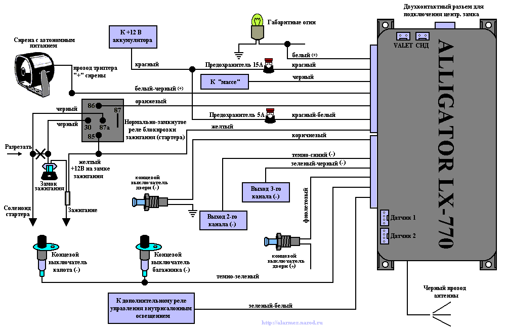 В завершение назовем одну модель, которая является исключением. Речь идет о сигнализации LX-8000RS: пейджером ее снабдить нельзя, а оборудовать автозапуском – можно. В доказательство приводим схему.
