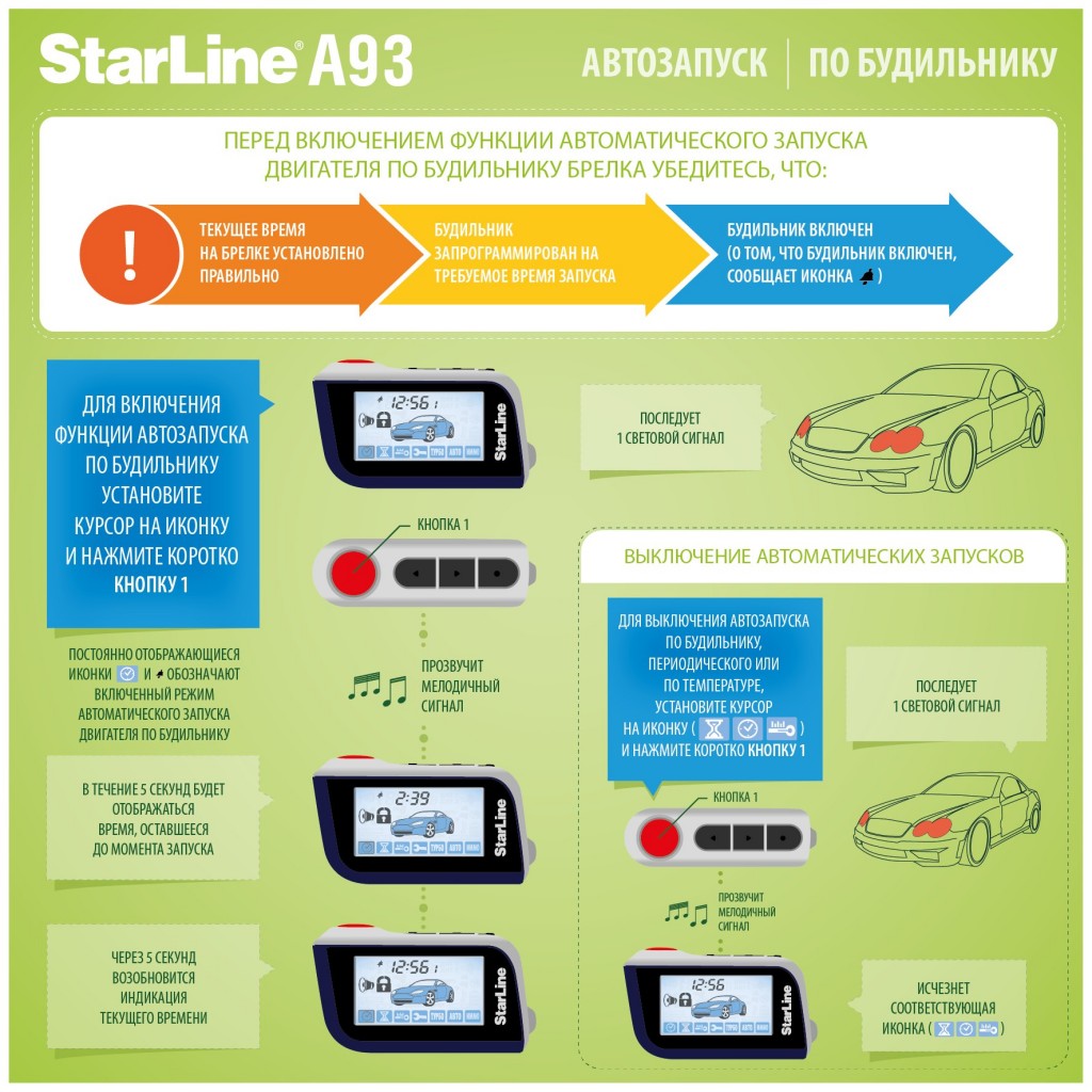 В системах Старлайн Б9 можно настроить автоматический запуск по будильнику. Предварительно стоит убедиться, что время на брелке установлено правильно, для корректного выполнения программы.