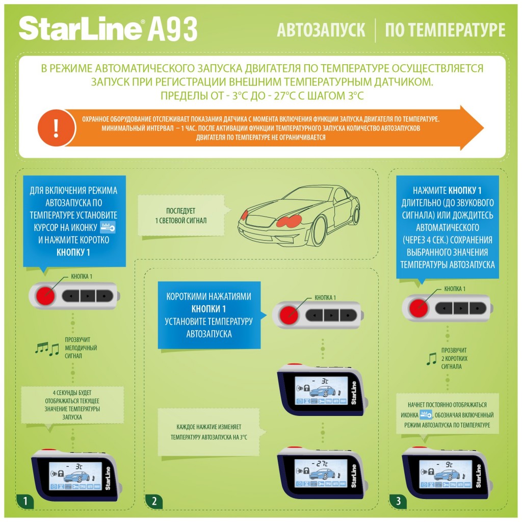 Настраивается эта опция нажатием «термометра» и кнопки «3». Автомобиль подаст световой сигнал фарами и на брелоке появится температура, при которой будет активироваться автозапуск.