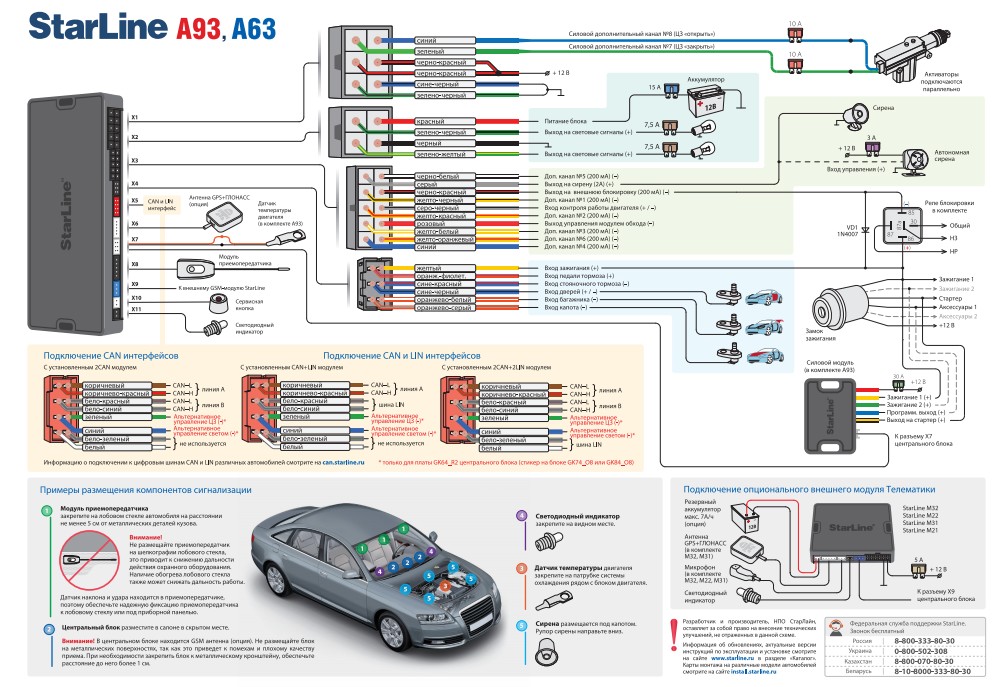 Что касается центрального блока сигнализации Starline, то здесь также нужно учесть несколько советов. Монтаж блока с прочими элементами должен производиться с основной проводке только после того, как будет завершена укладка кабелей. Подключение каждой отдельной модели сигнализации Starline производится в соответствии с картой и сервисным мануалом. Перед установкой изучите внимательно инструкцию!
