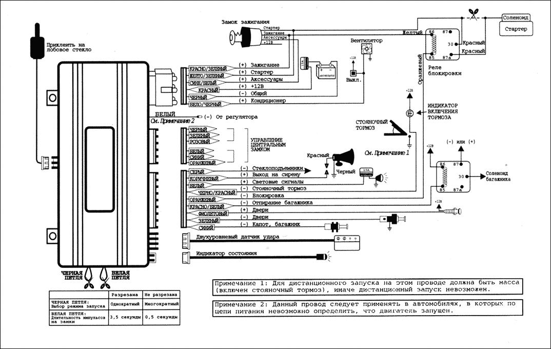 - Проводник для подключения к центральному замку автомобиля. Он оборудуется колодкой на 6 контактов.