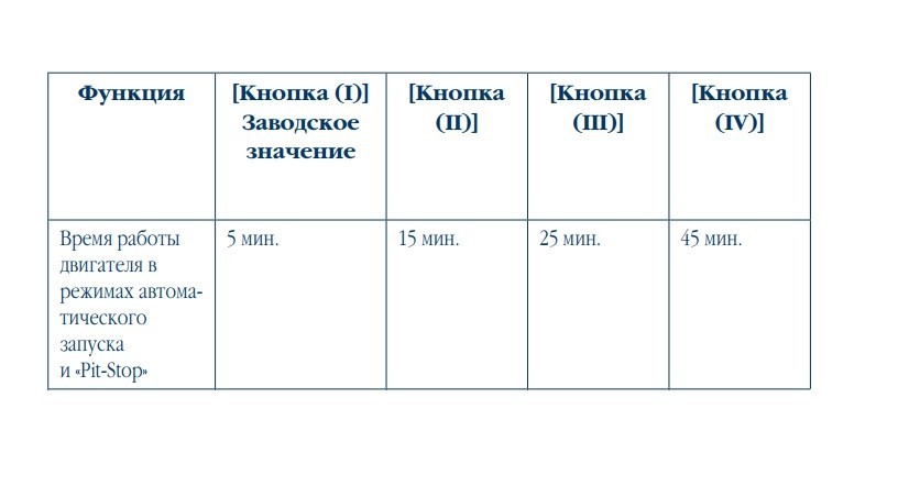 Время прогрева при дистанционном запуске возможно запрограммировать на стандартные значения 5, 15, 25, 45 минут. Для этого необходимо зажать комбинацию кнопок I и IV, и перейдя в меню выбрать время работы двигателя. Какие кнопки нажимать для активации требуемой длительности указано в нижеприведенной таблице.
