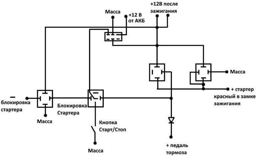 Сначала мы рассмотрим схему установки кнопки «Старт-Стоп», изготовленную своими руками, на автомобиль ВАЗ. По сути, это простейший вариант системы со следующим принципом работы: