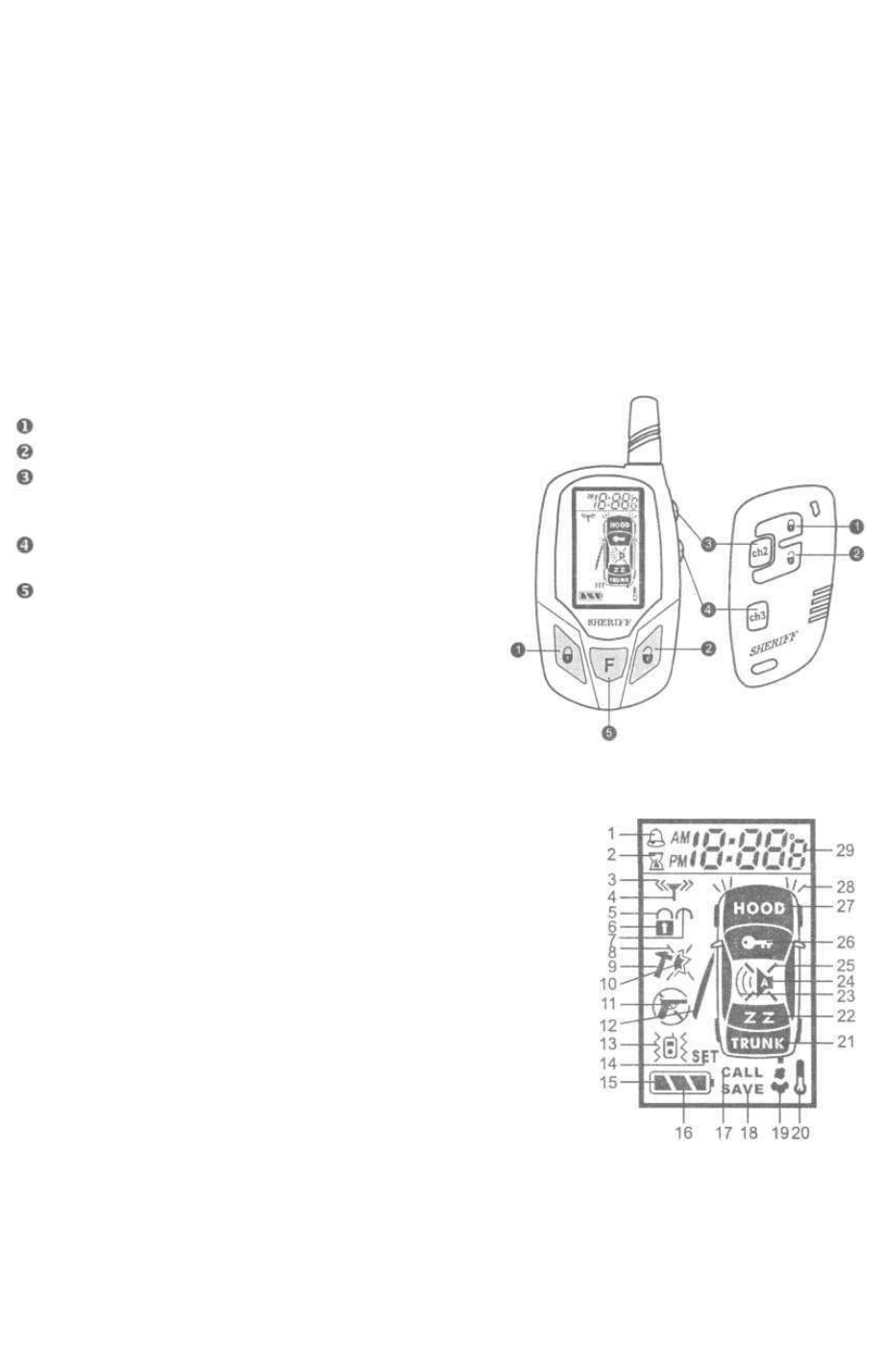 гнал вашего брелока-передатчика, охранная система на него просто не отреагирует. Если кнопку на вашем брелоке-передатчике нажимать более 30 раз, когда он находится вне пределов управления охранной системой (например, с ним играют дети), система не будет реагировать на вызов брелока-передатчика, когда вы снова решите им воспользоваться. Вам необходимо синхронизировать ваш брелок-передатчик с приемником охранной системы. Для этого просто два раза в течение одной секунды нажмите кнопку постановки системы на охра- ну/снятия системы с охраны на брелоке-передатчике. После этого система снова будет реа- гировать на все команды дистанционного управления.