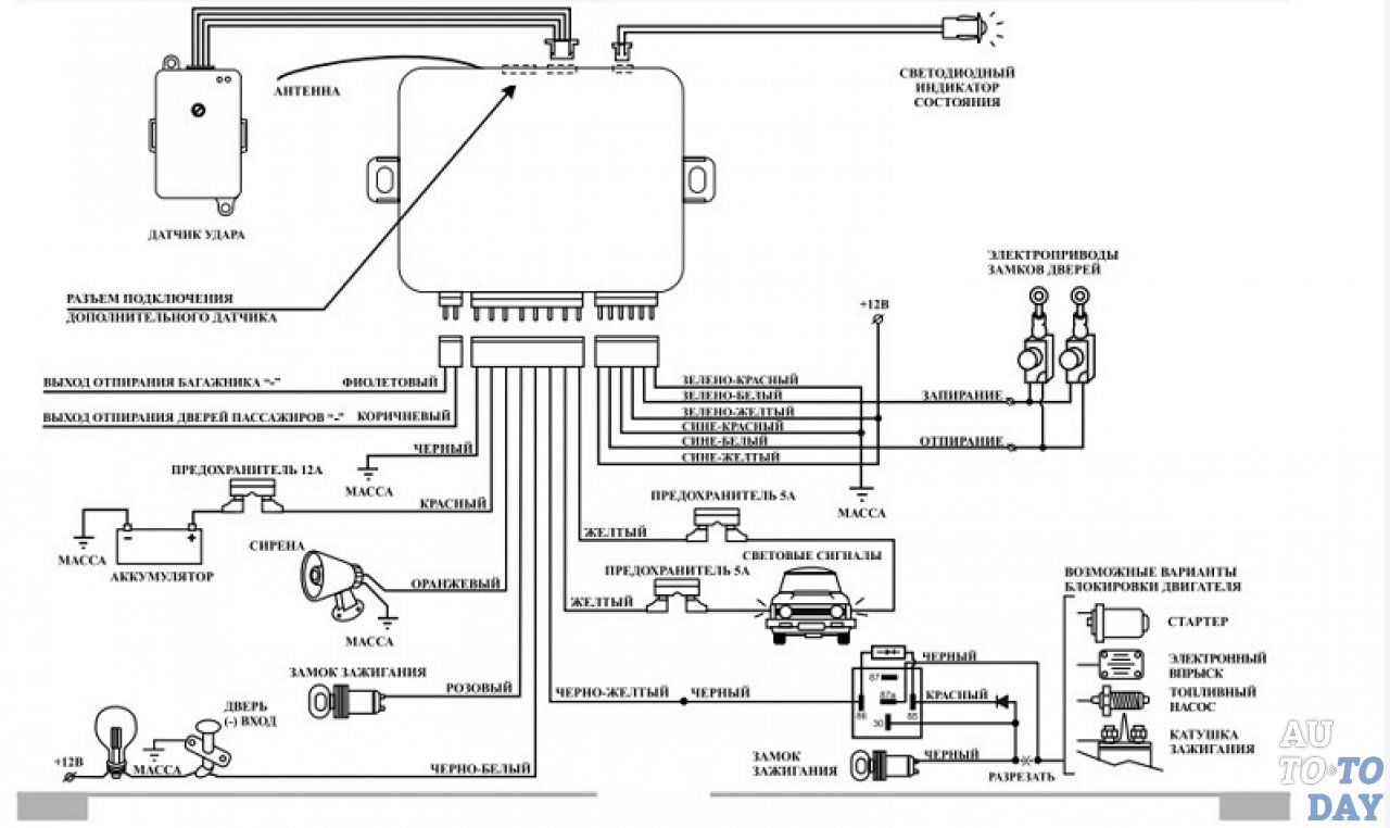 Схема подключения Несмотря на довольно трудоёмкий процесс установки автосигнализации своими руками, потраченные усилия не будут напрасны, ведь это позволит сэкономить неплохую сумму денег (чаще всего стоимость услуг профессионала приравнивается к цене самого комплекта сигнализации).