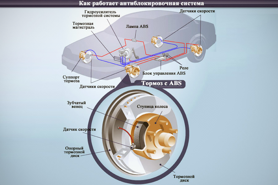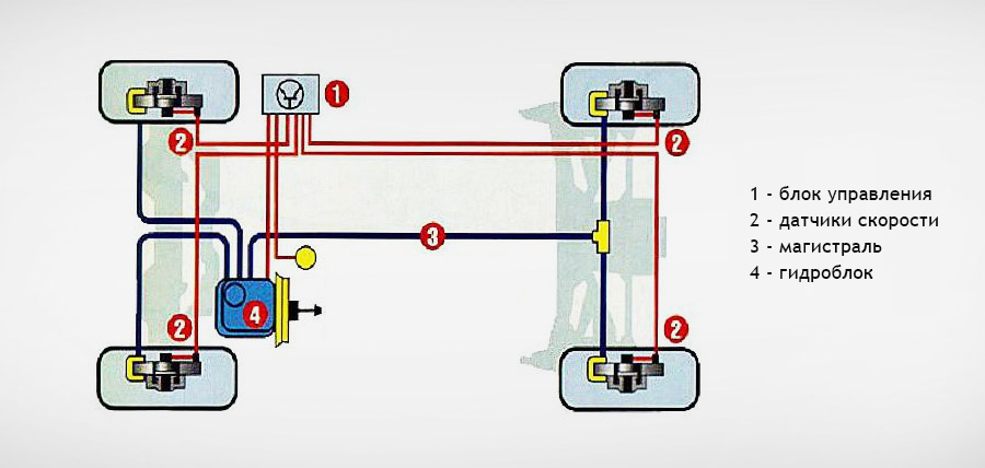 Конструкция системы подразумевает наличие БУ, датчиков контроля скорости и гидравлического модулятора.