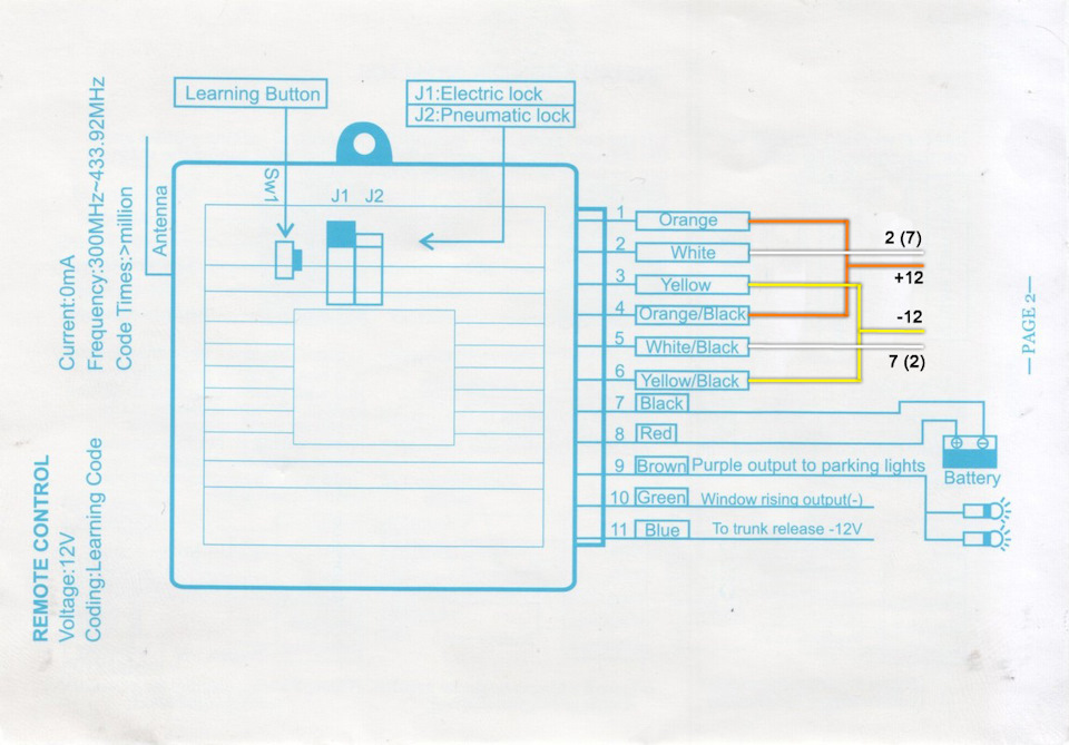 PS: Если при нажатии на пульте на кнопку блокировки двери разблокируются, а при нажатии на кнопку разблокировки блокируются, то нужно поменять местами белый и белый с черным провода (2, 7 на 7, 2 или наоборот), либо поменять полярность у жёлтых и оранжевых проводов. Кому как будет удобнее.