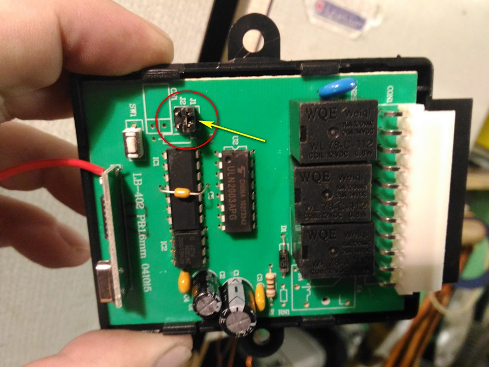 1. Прежде всего вскрываем блок управления (крышка на защёлках) и проверяем правильность установки джампера. Он должен стоять на группе контактов J1. По умолчанию у меня почему-то стоял на J2.