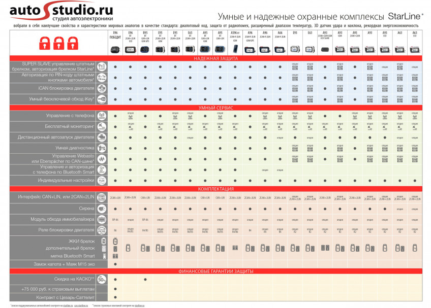 Актуальные характеристики охранных комплексов StarLine можно найти на официальном сайте производителя, также вы можете скачать сравнительную таблицу выпускаемых производителем устройств и подобрать наиболее подходящий вам вариант.