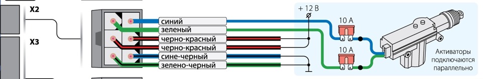 Здесь синий и сине-черный сигнал отпирания, а зеленый зелено-черный сигнал запирания.Теперь, для того чтобы двери закрылись нужно разорвать коричневый провод. Для открывания нужно соединить его и подать минус.По этому провода и разъема X2 нужно соединить следующим образом