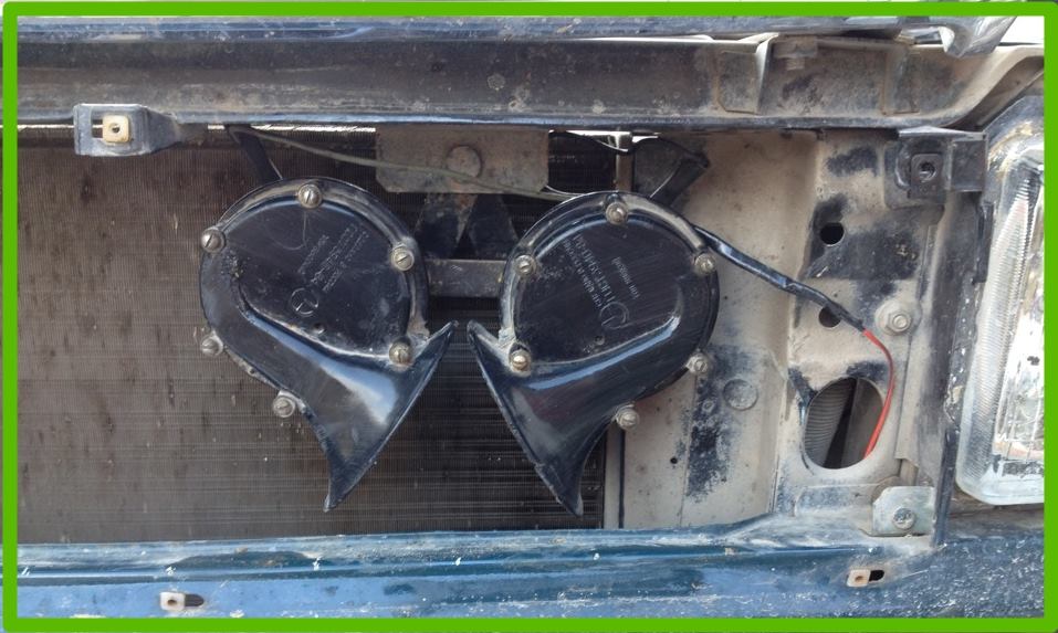 - Кронштейны устанавливаем на верхнюю панель перед радиатором охлаждения в соответствии с размерами пневмоклаксона и конструкцией его креплений.