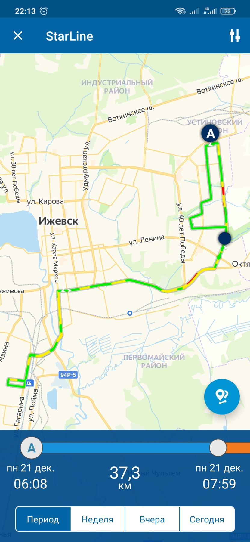Собственно где цвет маршрута означает:Зеленый — скорость до 60км/чЖелтый — скорость от 61 до 90 км/чКрасный — скорость свыше 90 км/ч.Данные пороги можно самостоятельно менять на сайте starline.online и выставить более подходящие вам. Кстати данный сайт более расширенный функционал по сравнению с приложением. Он к пройденному километражу и скорости так же указывает все временные интервалы сколько машина стояла и сколько она была в движении: