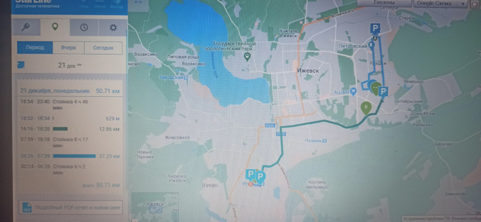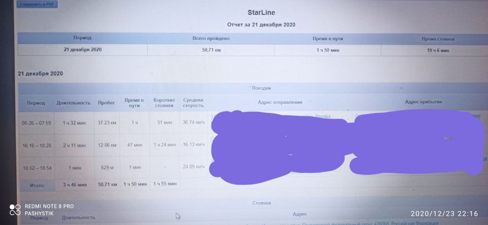 Что еще из интересного? Можно нажать на подробный ПДФ отчет! и получим подробности по всему маршруту. Там будет Общий пробег машины за день, время в пути. Все поездки расписаны поминутно. Так же указана средняя скорость движения и адрес отправление и прибытия (причем ссылка кликабельна сразу открывает яндекскарты):