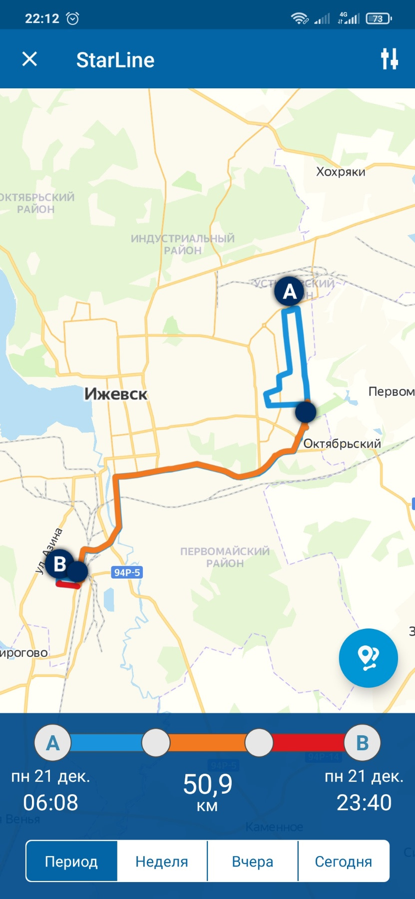 После этого заходим в приложение и видим где ТОЧНО стоит машина. После установки антенны точность позиционирования около 2-7 метров. Так же после этого расширился функционал приложения. Теперь оно строит пройденные маршруты с указанием километража маршрута: