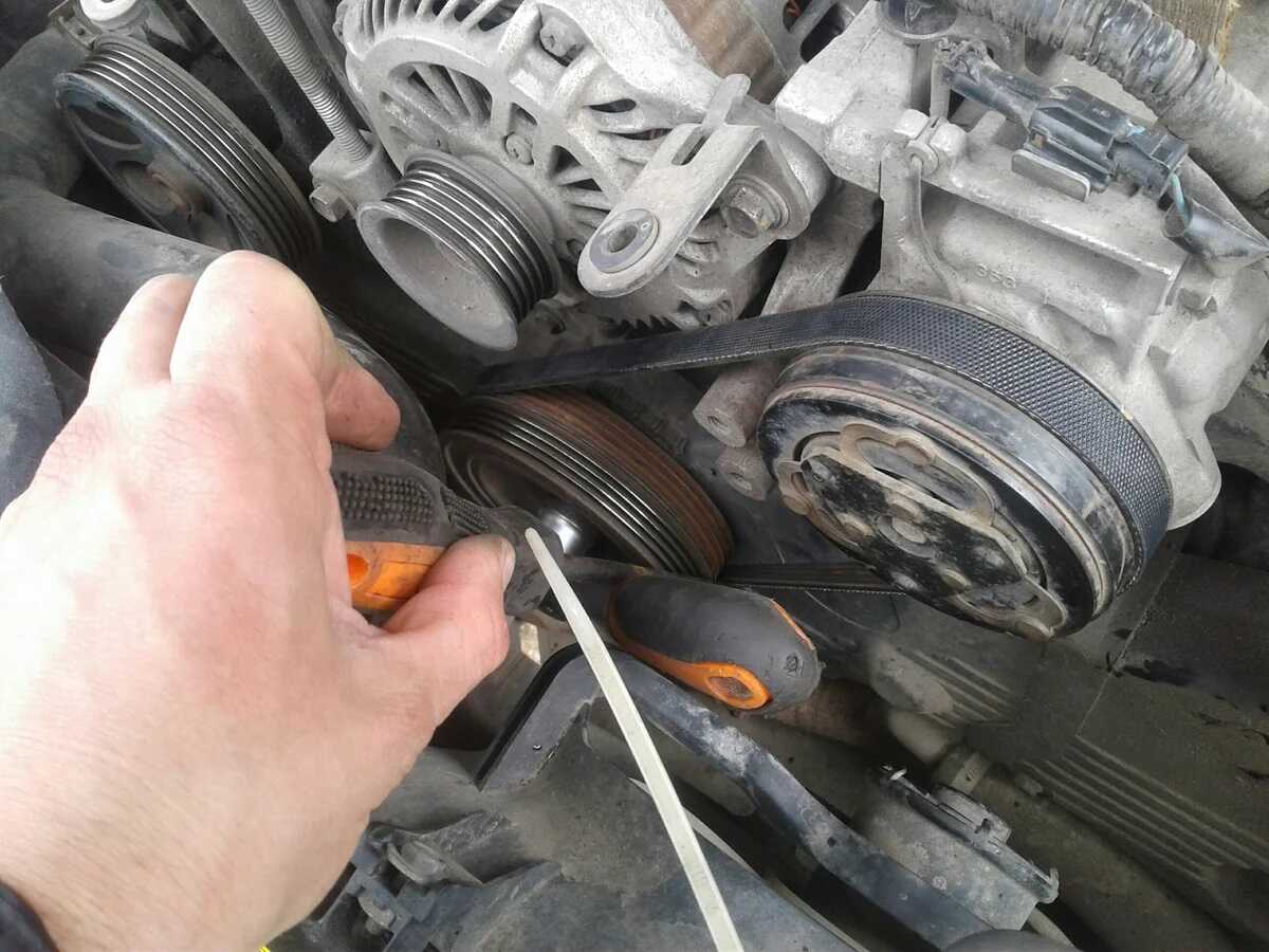 - Оденьте новый ремень генератора и привода компрессора, выньте фиксирующую отвертку – ремень будет натянут автоматически.