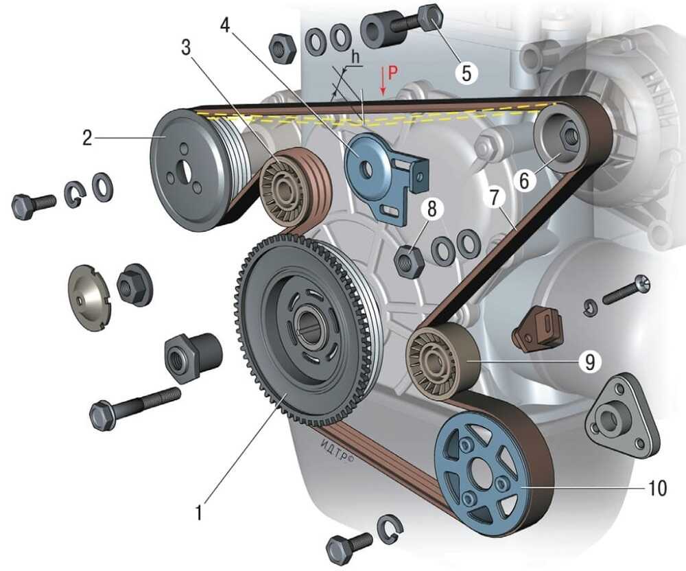 Для сборки, снятые ранее комплектующие устанавливаются в обратном порядке. Приустановке ремней вспомогательного оборудования нужно отрегулировать их натяжение.