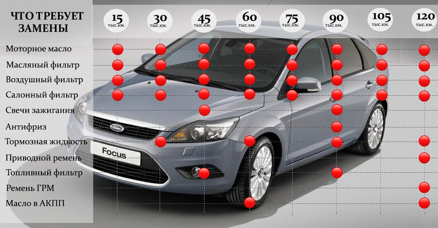 Здесь нужно отталкиваться от официального регламента по проведению технического обслуживания. В мануале к Ford Focus 2 говорится, что интервал замены составляет 50-60 тысяч километров по пробегу. Если ориентироваться на возраст, тогда это 5-6 лет с начала эксплуатации. Отталкиваться нужно от того, что наступит раньше.