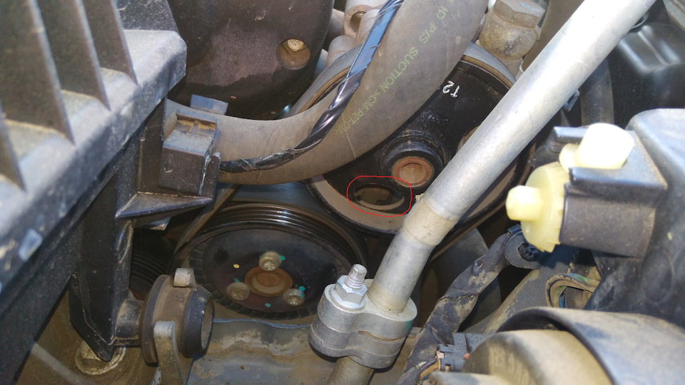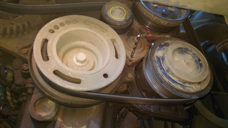 После данных манипуляций гур ослабнет, прижимаем его в сторону мотора и стягиваем ремень гур, можно даже его разрезать и вынуть для простоты.Теперь прыгаем ближе к земле, берем головку на 20 в моем случае (у кого то и 19 лезет, а у меня нет) и накинув инструмент на данное место, выделенное красным, тянем против часовой стрелки чтобы совместить отверстия ниже, и вставляем туда стопор, в моем случае это сверло на 5, можно заклепку или любой подходящий предмет.