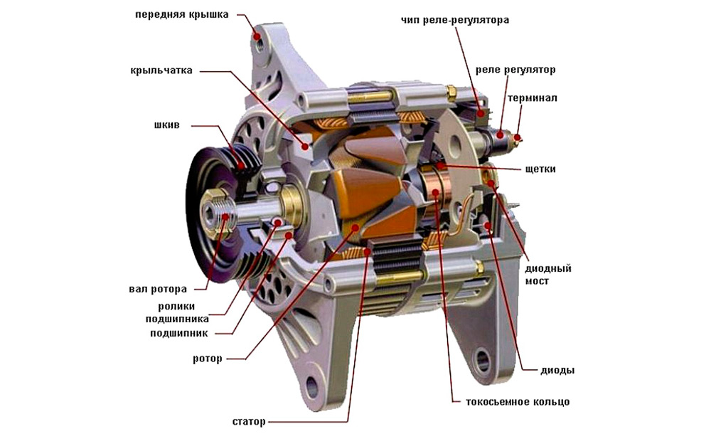Его принцип работы достаточно прост: при вращении ротора в его обмотке возникает возбуждение, которое приводит к генерации магнитного поля. Статор — это магнитное поле преобразует в переменный ток, диодный мост переменный ток преобразует в постоянный, а регулятор напряжения следит, чтобы выходные параметры генератора были стабильными вне зависимости от того, с какой частотой вращается коленвал двигателя. Отметим, что при пуске двигателя работу всех систем автомобиля, и прежде всего системы пуска, обеспечивает аккумулятор, но как только обороты коленвала достигают определённой величины, цепь питания в АКБ переключается на генератор.