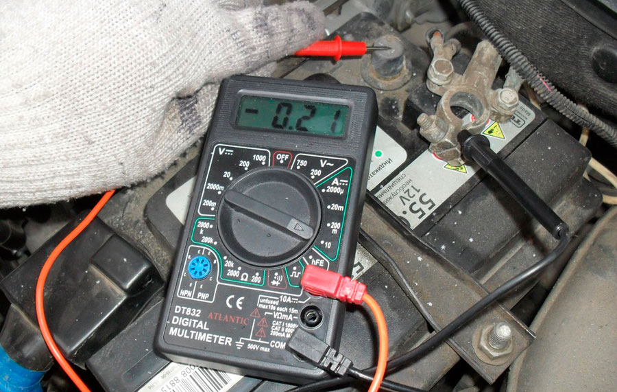 - Подсоединить минусовую клемму тестера к контактной клемме АКБ, плюсовую клемму мультиметра подключить к плюсовой клемме автомобиля.