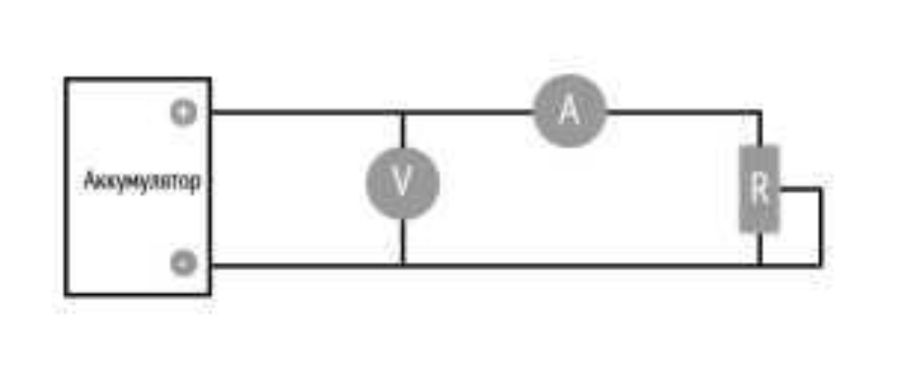 Самый простой вариант – автомобильная лампа на 60 Вт. Есть и более сложные примеры, чем разрядить автомобильный аккумулятор. Если найдёте мощный реостат, способный держать 5 и более ампер, подойдёт и он. Включаете его в цепь вместе с амперметром последовательно. Вольтметр подключается параллельно контактам батареи. Теперь, двигая ручку реостата, устанавливаете требуемый ток и одновременно наблюдайте за напряжением. За какое время разряжается аккумулятор автомобиля? Всё зависит от типа АКБ, ёмкости. Обычно это 6–10 часов. Ниже представлена электрическая принципиальная схема данного способа разрядки: