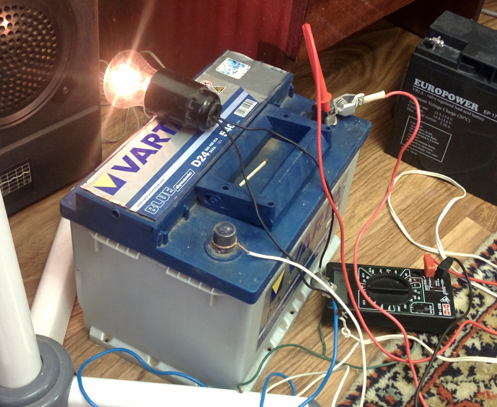 - Снова подключают галогенную лампу и разряжают АКБ в течение пары суток. Далее выполняют правильную зарядку, с учетом полярности, пока напряжение не дойдет до отметки 14.4 В.