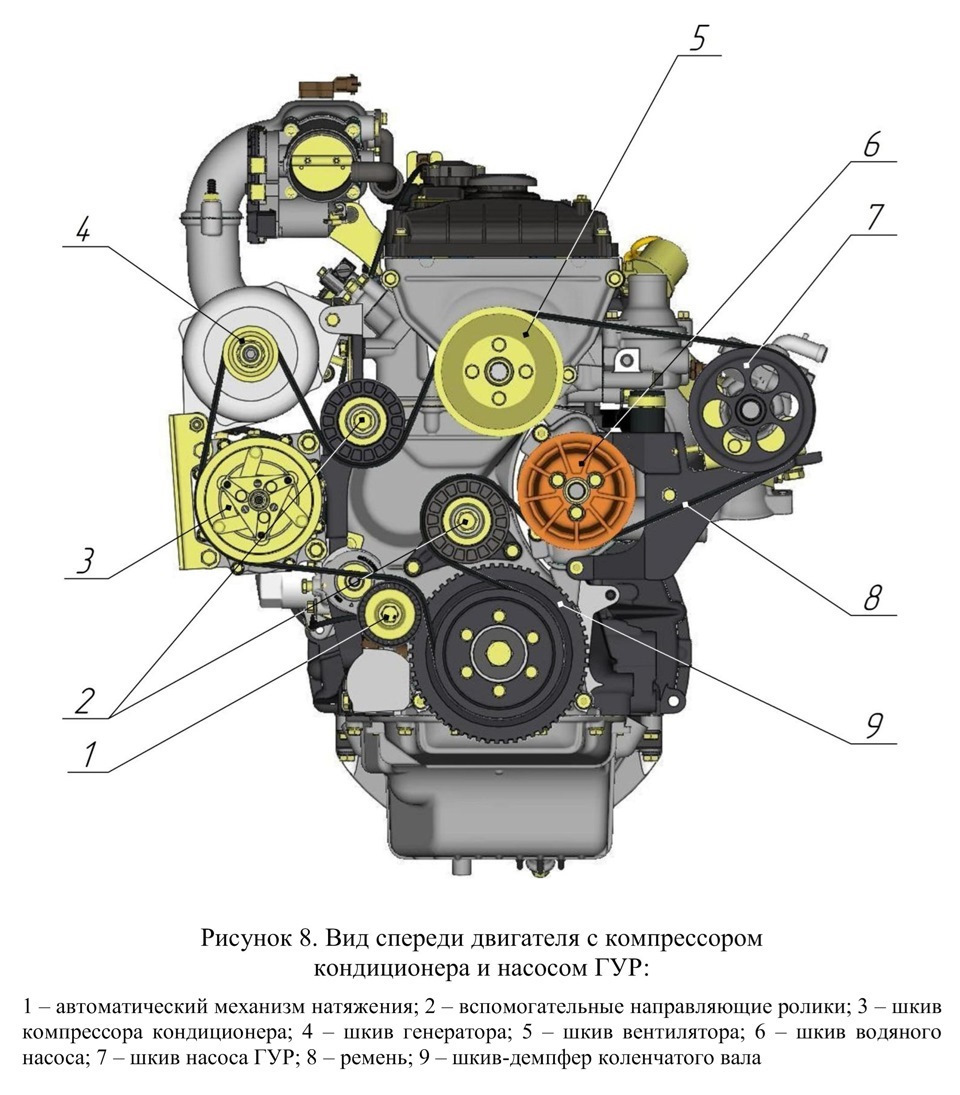 Схема привода механизмов в двигателе без кондиционера изображена ниже.