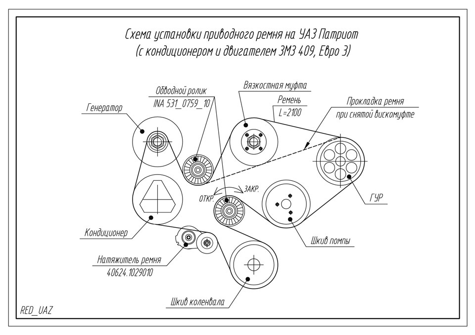 На автомобили марки УАЗ Патриот используются двигатели с кондиционером моделей Евро-3 и Евро-4. В них установлен поликлиновой ремень. Он представляет собой замкнутый контур. На внутренней стороне изделия размещено несколько продольных полос, также называемых ручейками или клиньями. За счет такой конструкции оно и получило свое название.
