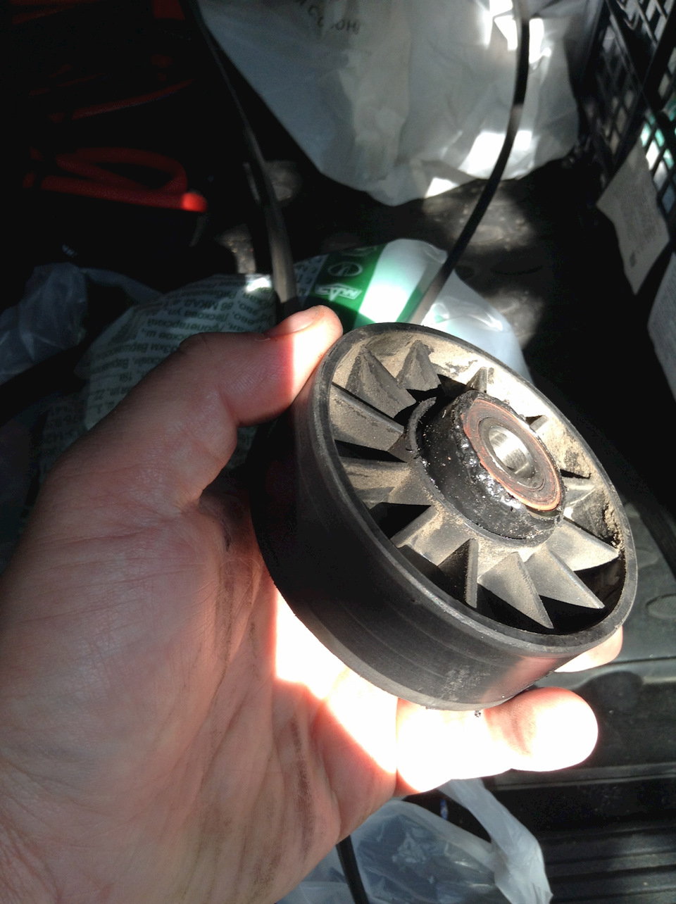 Итак вчера поздно вечером возвращаясь в Москву по Киевскому шоссе, когда до дома оставалось примерно 90 км — это случилось. Визуальный осмотр показал что верхний обводной ролик заклинил, его перекосило и ремень соскочил.