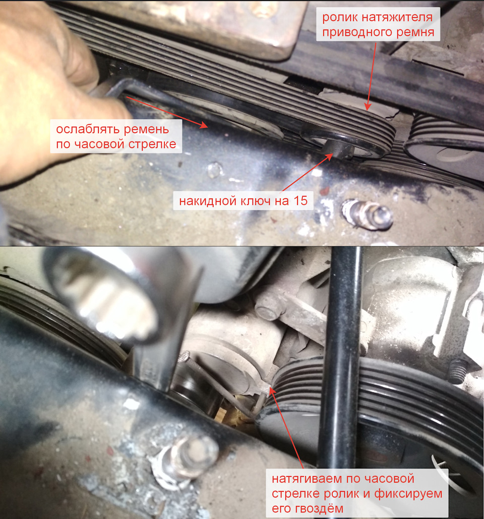 2)ключом на 15, двигая натяжитель ремня вспомогательных агрегатов ПО ЧАСОВОЙ СТРЕЛКЕ, как будто мы его закручиваем ослабить натяжение и скинуть ремень.