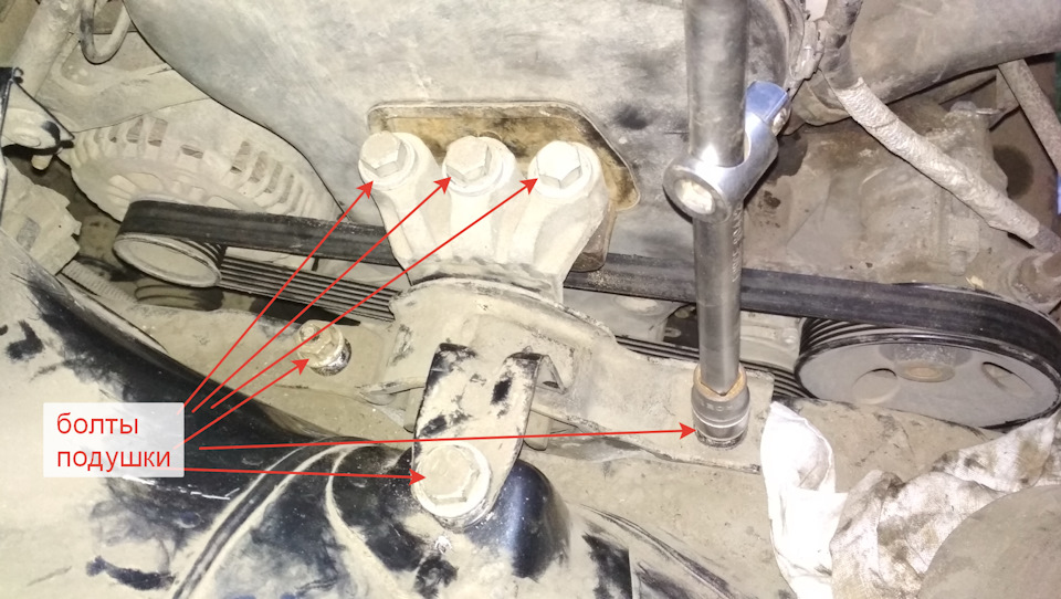 3. Далее снимаем защиту и приподнимаем двигатель, чтобы ослабить нагрузку на опору