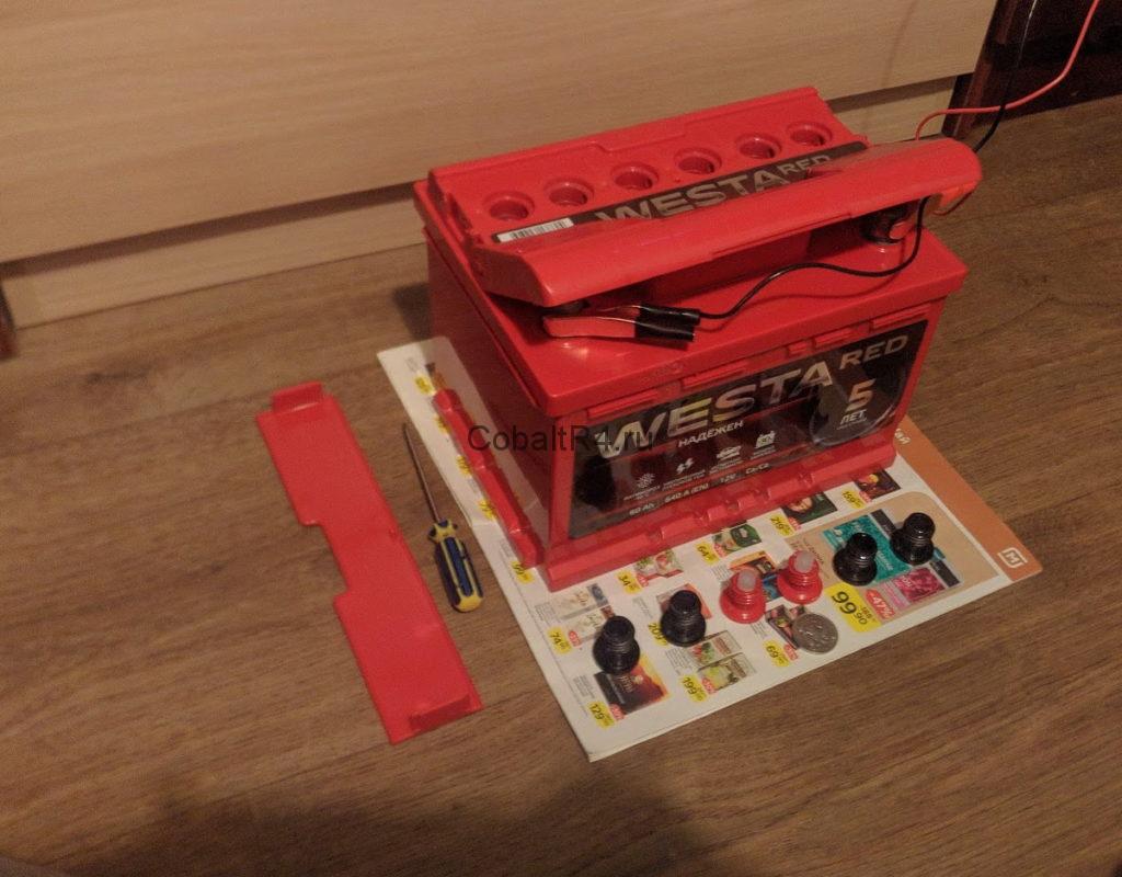 Накидываем крокодилы на клеммы АКБ, не забывая выкрутить пробки банок и подстелить под всё это безобразие газетку: