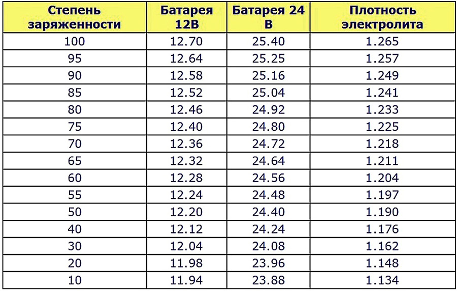 Приступая к расчетам, учитывайте неполный заряд аккумулятора, мороз. Измерить напряжение батареи можно при помощи вольтметра. Отключите аккумулятор. Цифры от 12,2 В и меньше говорят о заряде менее чем 50 %. Плотность электролита от 1,26 – 1,29 г/см3. Здесь более низкий показатель говорит о большей степени разрядки.