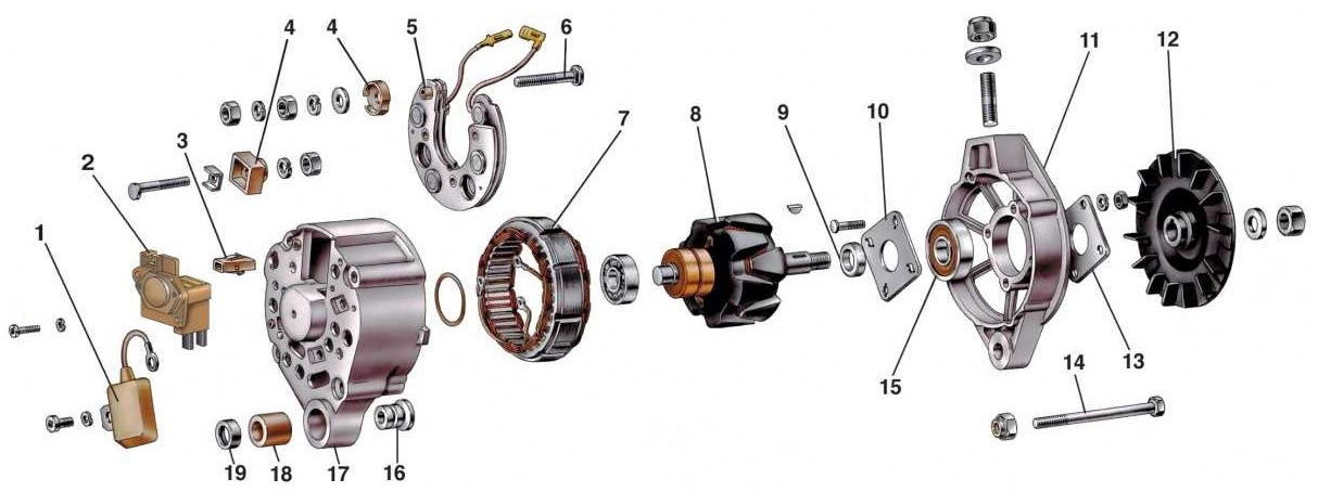 1 – конденсатор; 2 – регулятор напряжения в сборе с щеткодержателем; 3 – колодка вывода дополнительных диодов; 4 – изолирующие втулки; 5 – выпрямительный блок; 6 – контактный болт; 7 – статор; 8 – ротор; 9 – дистанционная втулка; 10 – внутренняя шайба крепления подшипника; 11 – крышка со стороны привода; 12 – шкив; 13 – наружная шайба крепления подшипника; 14 – стяжной болт; 15 – передний шарикоподшипник ротора; 16 – втулка; 17 – крышка со стороны контактных колец; 18 – буферная втулка; 19 – поджимная втулка