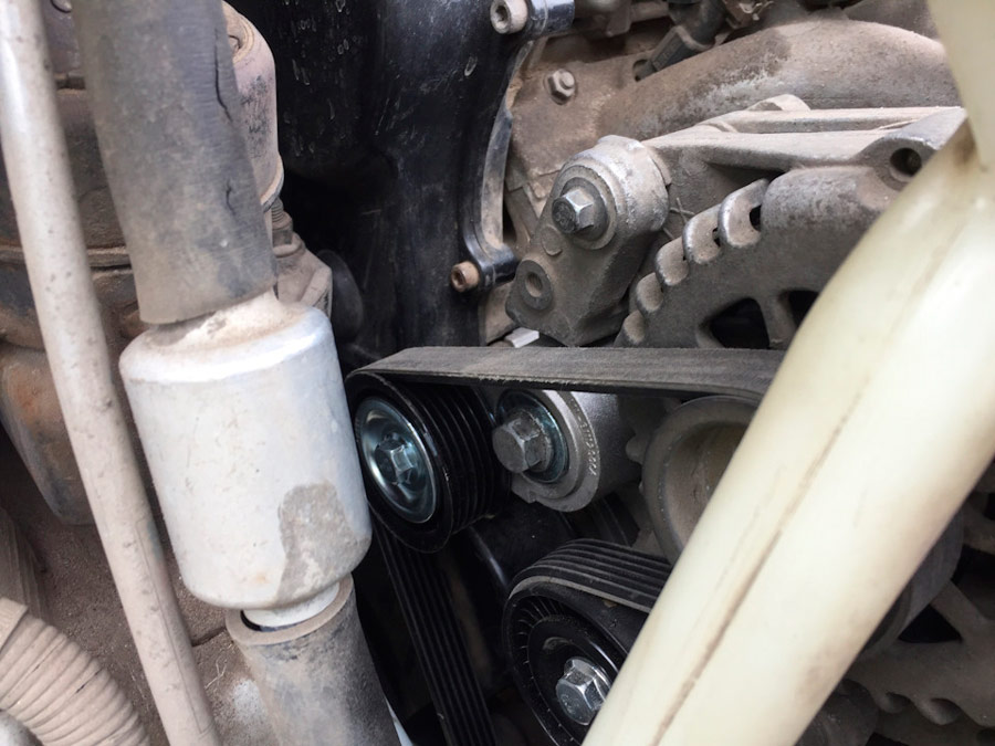 Сначала ремень следует натянуть на шкив коленчатого вала. Увы, это делать придётся чуть ли не на ощупь, поскольку патрубок интеркулера будет мешать. Плюс места там откровенно немного. Но вы справитесь.