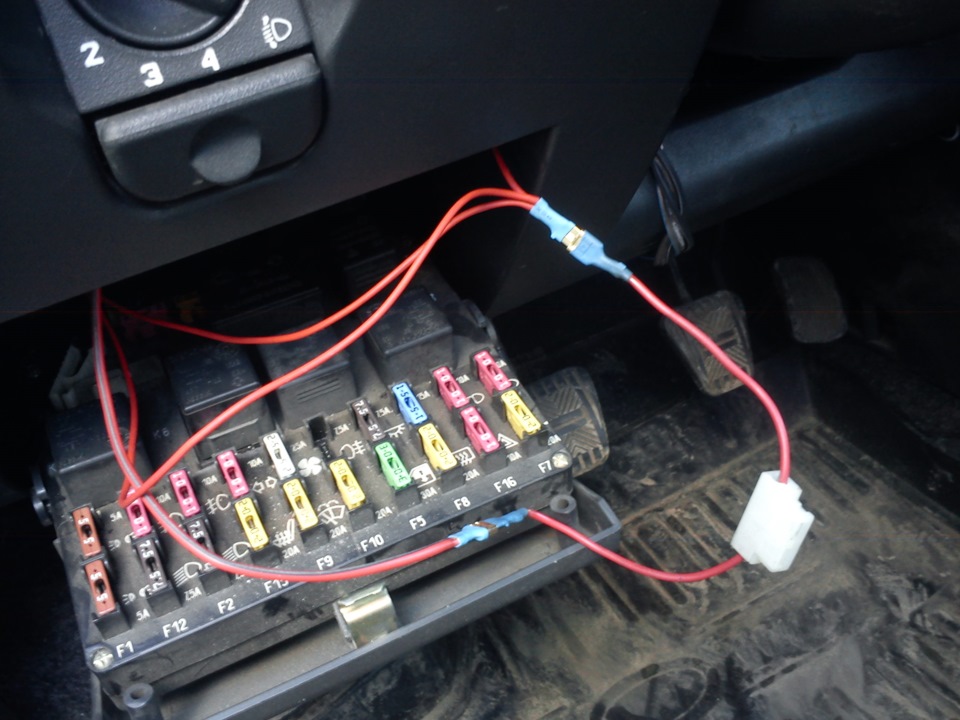 Скидываем клемму с аккума. Нам понадобится от плафона (вроде красно-белый провод). В него я врезался когда делал шумку крыши. Заодно можете сразу протянуть переменный от плафона (вроде черно-белый провод) (загорается когда, открыта любая дверь), он пригодится для будующей подсветки ног. Тянем до монтажного блока, дальше я поставил предохранитель (пока не знаю на сколько ампер лучше, стоит 7.5), без него в случае чего сгорит F7 в монтажном блоке, проверено).