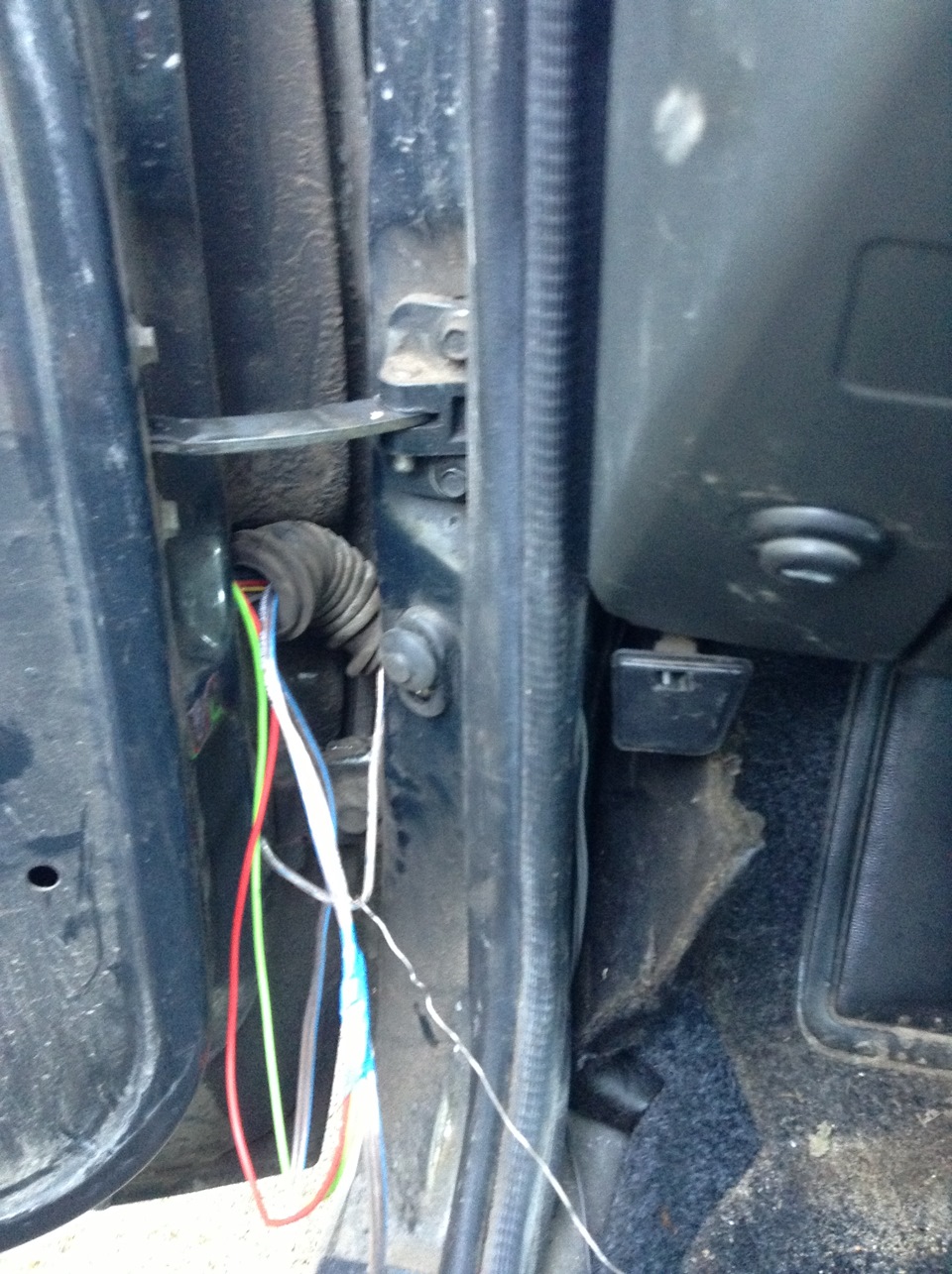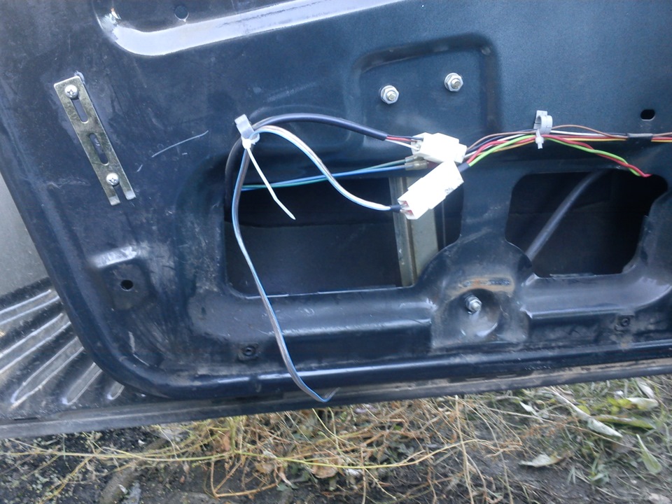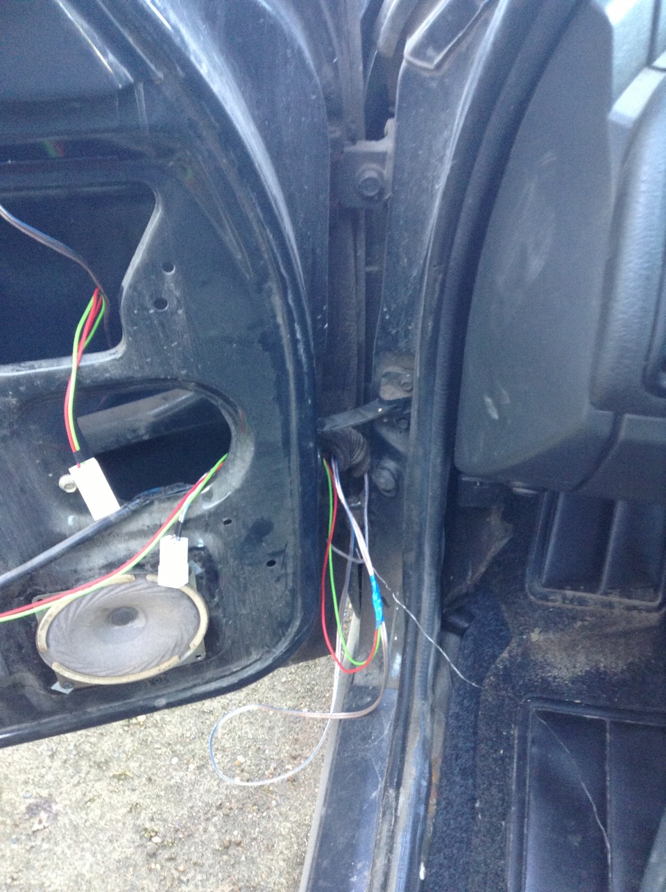 Ну что. Поехали.1. Снимаем карты всех дверей2. Протаскиваем плюсовой и минусовой провод через гофру каждой двери. Я делал это так. Сначала вынимаем гофру из двери и стойки двери. Протаскиваем провода в дырку. Затем проталкиваем проволку через гофру, зажимаем ей провода и тянем через гофру, потом пропихиваем через дырку в стойке(можно проволкой или так если повезет). Заодно сразу протянул провода для подогрева зеркал.