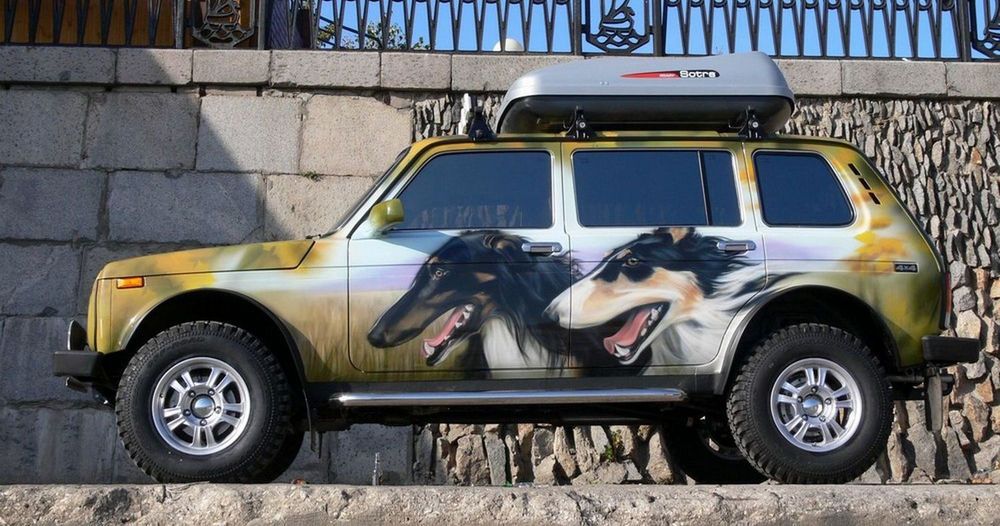 Покупка и установка новых порогов и радиаторной решётки для Нивы — задача несложная. Но если изначально вы задумали при окрашивании кузова использовать аэрографию, то придётся нести приобретённые детали к специалистам. Человеку без опыта не удастся создать ровный рисунок без дефектов.