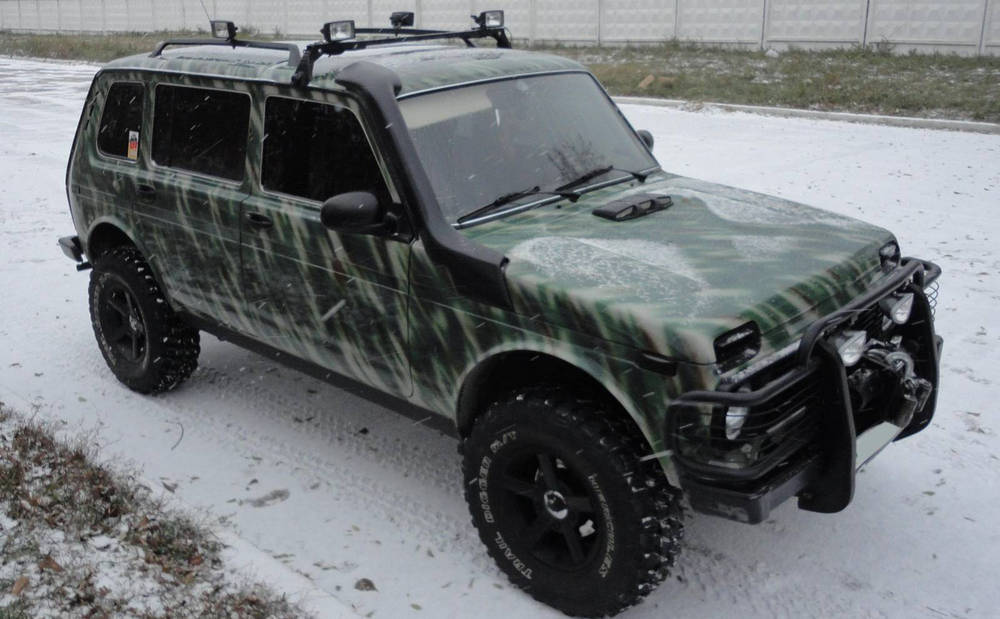 Именно внешний облик автомобиля в первую очередь бросается в глаза, поэтому именно его обновлением мы и займёмся. Редко какой тюнинг автомобиля обходится без окрашивания кузова. Просто освежить краску — это не вариант, особенно при современных возможностях. Если нет желания изощряться и создавать на кузове произведения искусства, то можно ограничиться покрытием жидкой резиной или проклейкой карбоновой плёнки. Но всё же пятидверная Нива более эффектно смотрится с 3D аэрографией.