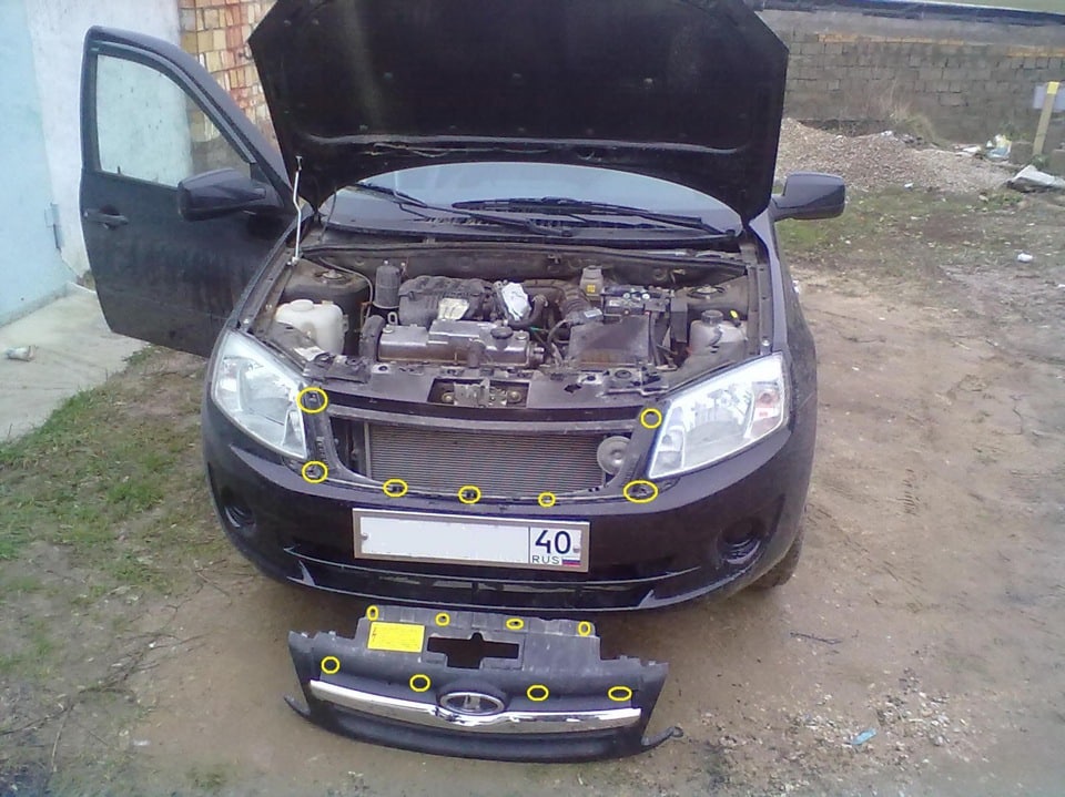 На бампере установлены верхняя и нижняя решетки радиатора, а также фары. Если предстоит замена, все эти элементы легко снимаются. Решетка держится на металлических защелках. Эти защелки можно поддеть отверткой и снять при помощи плоскогубцев. Затем решетка отсоединится. Фары держатся на саморезах, их нетрудно раскрутить за одну-две минуты.