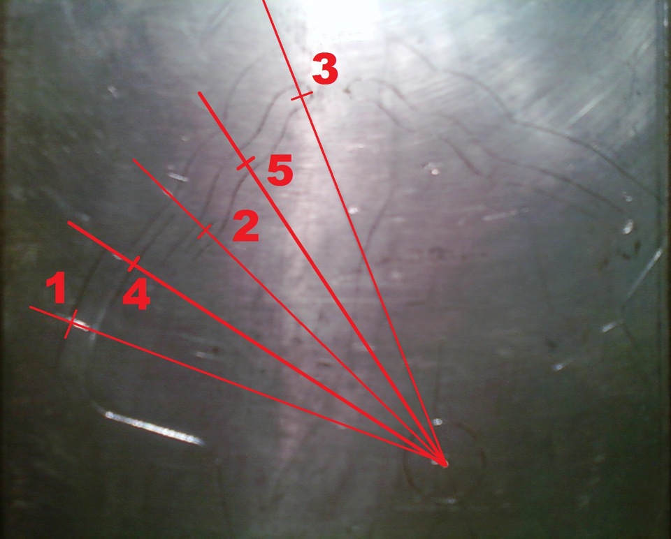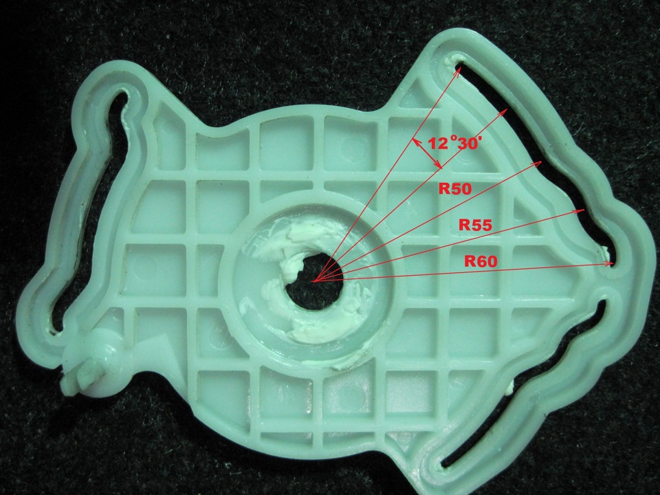 Далее самое интересное…Исходя из того, что нам нужно, расчитываем координаты первых двух положений ПУ отопителя. Я планировал в первом положении открыты: салон (100%), лобовое (100%); во втором положении — ноги (50%), салон (50%), лобовое (50%). Далее — положения по мануалу.В первом положении (как и в последнем) заслонка л/стекла должна быть открыта. Во втором (как и в предпоследнем) — открыта на 50%. В третьем — заслонка закрыта. Т.е. форма копира должна быть симметричной. В моём случае она имеет форму «чайки». На заготовке размечаем точку «1» первого положения рычага: R60, угол 50 градусов (координата зеркальна точке «3»). Точка «2» — R50, угол 25 градусов. Углы можно размечать по транспортиру.