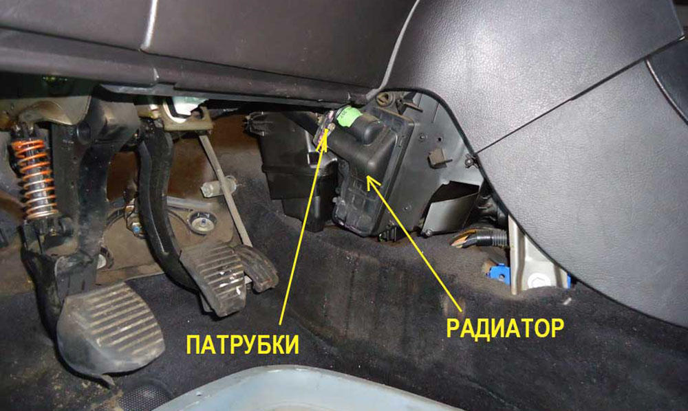 3. Теперь ныряем под руль и видим кучу всего, но нам нужно смотреть в зону обозначенную красными стрелками — там и находится резистор. (Зелеными стрелками показан мотор печки, но об этом позже):