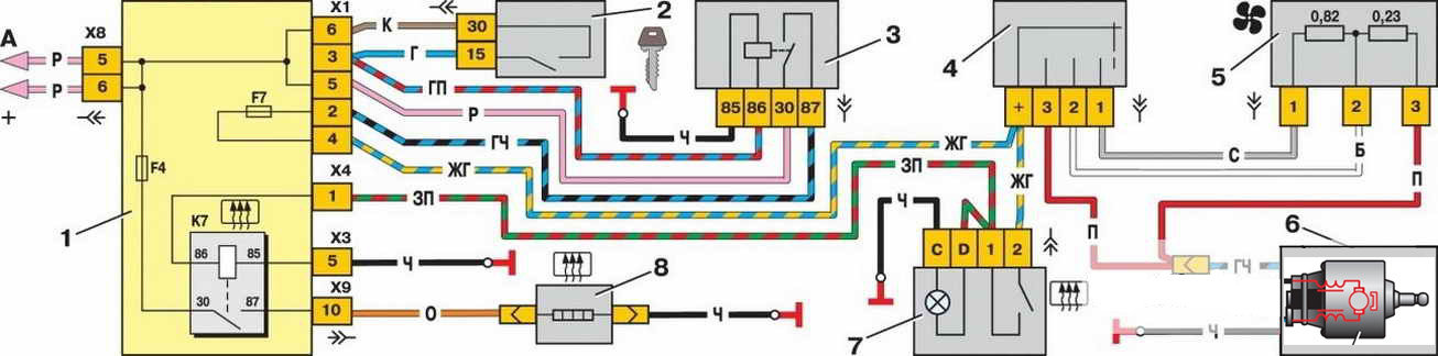 — Электродвигатель вентилятора отопителя («печки») может подключаться к бортовой сети либо напрямую (самая высокая скорость), либо через дополнительный резистор имеющий две спирали сопротивления (0,23 Ом и 0,82 Ом). Если в цепь включены обе спирали — скорость низкая, если одна 0,23 — скорость средняя.