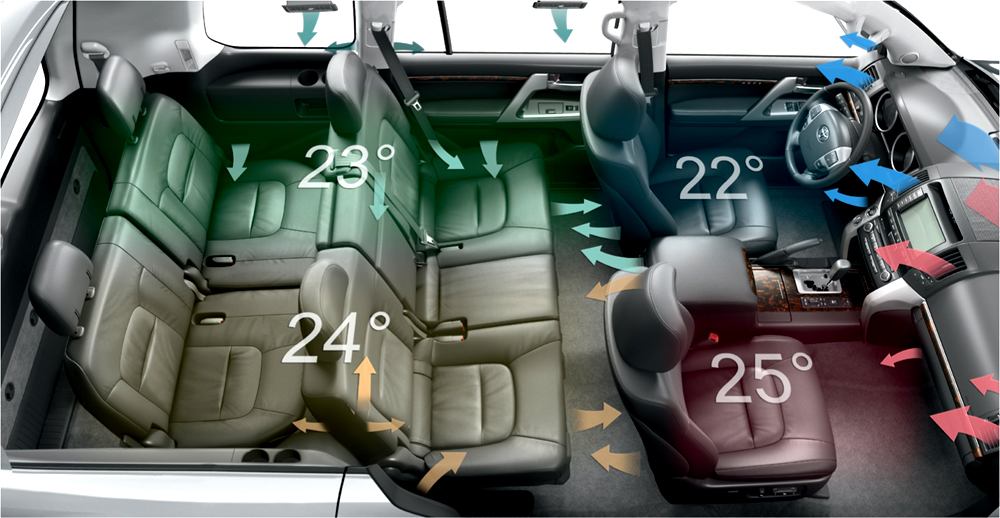 Это отопление и кондиционирование, заключённое в один блок и управляемое одним модулем. Позволяет производить как ручную настройку, так и настройку в автоматическом режиме. При установке автоматического режима воздушный поток выдувается из дефлекторов и имеет такую температуру, которая позволяет поддерживать заданные значения. При изменении входных параметров блок управления вносит соответствующие изменения, влияющие на температуру потока, чтобы условия в салоне оставались неизменными. Доступен режим рециркуляции воздуха, позволяющий производить забор воздуха не с улицы, а с салона авто, что позволяет значительно быстрее охладить салон. При включённом автоматическом режиме показания в передней части салона и в задней будут разными, что непременно вызовет разногласия между водителем и пассажирами заднего ряда, поскольку для каждого человека понятие «комфортная температура» индивидуальное, сложно подобрать параметры, которые будут идеальными для всех, кто находится в салоне автомобиля. Поэтому в полной мере отгородить водителя от участия в регулировке не получится, что негативно скажется на безопасности дорожного движения.