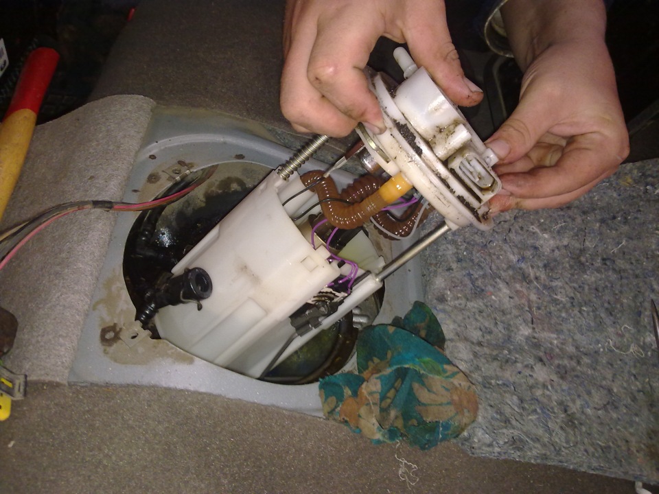 На форумах рекомендуется хотя бы раз в год проводить подобные инспекции. Симптомы забитой сеточки бензонасоса: тупление автомобиля при переключениии передач, автомобиль плохо набирает скорость, провалы на ХХ, вплоть до того, что машина глохнет. Нерадивые сервисмены, в зависимости от полета фантазии могут вам посоветовать заменить: бензонасос (1500 р), почистить инжектор промывкой (1200, а со снятием 1500-1600), заменить MAF-датчик (а на наши малышки он новый по экзисту 42000) и т.п. Кстати, забивание сеточки бензонасоса — болезнь демии распространенная. Если не охота ее чистить, то подойдет сеточка от ВАЗ 2110. Только при установке ее нужно будет развернуть на 180 градусов, иначе рама бензонасоса не встанет в положенное ей положение. Итак, решено — снимать, смотреть и при необходимости чистить! Для этого выкидываем все барахло из багажника, отодвигаем передний ряд сидений до упора вперед. Складываем и откидываем задний ряд сидений. Снимем обивку пола и багажника. Прямо под сиденьями, в их обычном положении видим квадратный лючок с подведенной к нему электоропроводкой. Снимаем лючок, для этого крестовой отверткой отвинчиваем болты крепления. Болты вывернуты, лючок сдвинут, насколько позволяет ппроводка. Перед нами верхняя часть станины бензонасоса, законтренная на 6 болтов под крестовую отвертку (4х8 вроде как). Сверху станины разъем папа-мама. Снимаем разъем. К бензонасоссу подходят подводная и отводная трубки