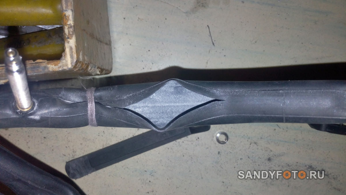 После я заправил камеру в покрышку, а покрышку надел на обод. Начал накачивать колесо. Поначалу всё было неплохо. Накачав минимальное давление, я прислушался: «Вроде ничего не шипит». Продолжил накачивать и тут камера «пшухнула». Когда я извлёк её на свет божий, то стало понятно, что с ней произошло. Она разошлась вдоль, как будто бы по шву. На самом деле не по шву, а параллельно ему: